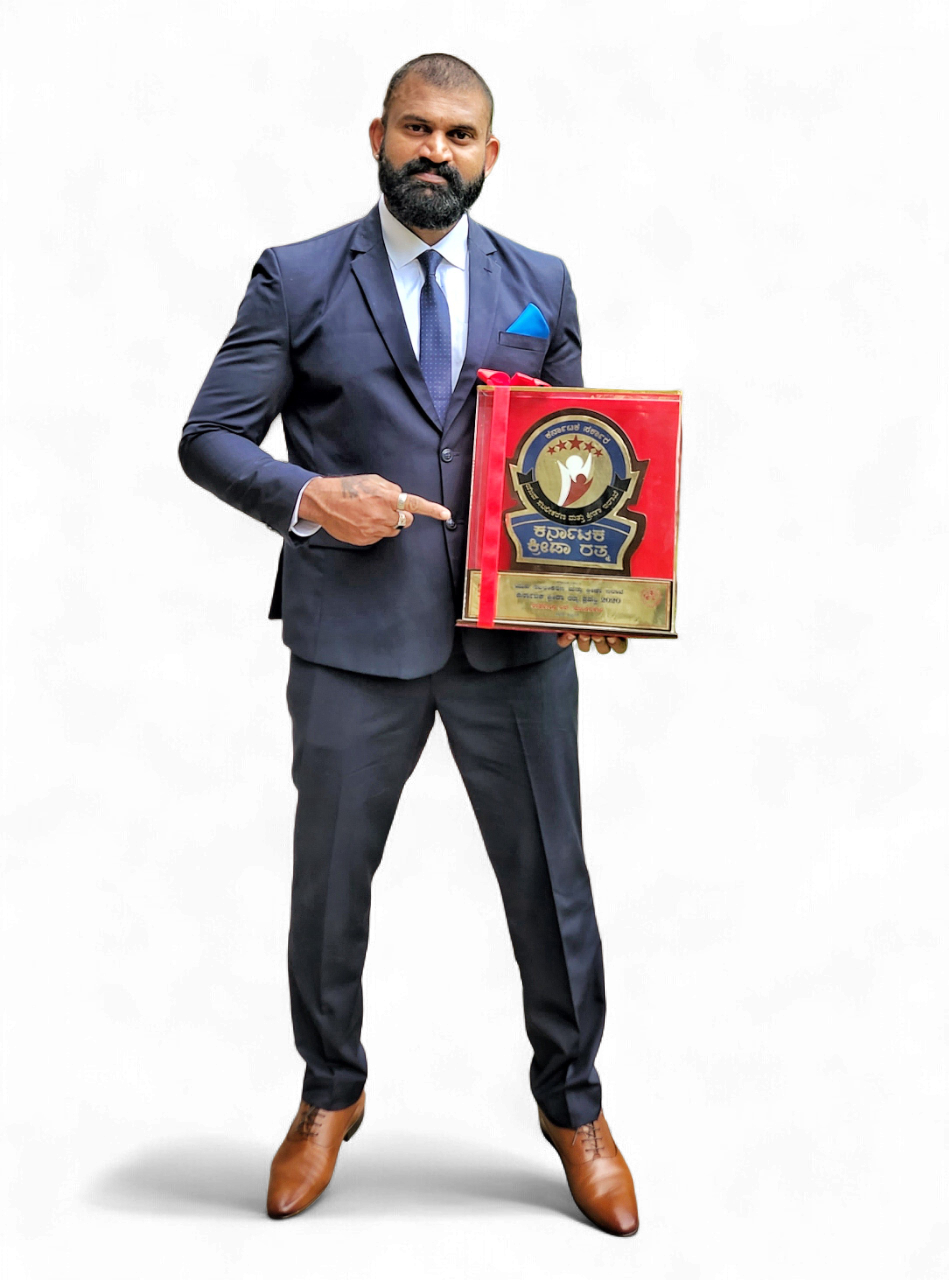 A Kreeda Ratna awardee honored by the Government of Karnataka, Raghavendra has proudly represented India at the World Powerlifting Championships (2016–2019), winning multiple international medals. He is a 25+ time National, State, and District medalist, and was crowned Strongman of India for three consecutive years.